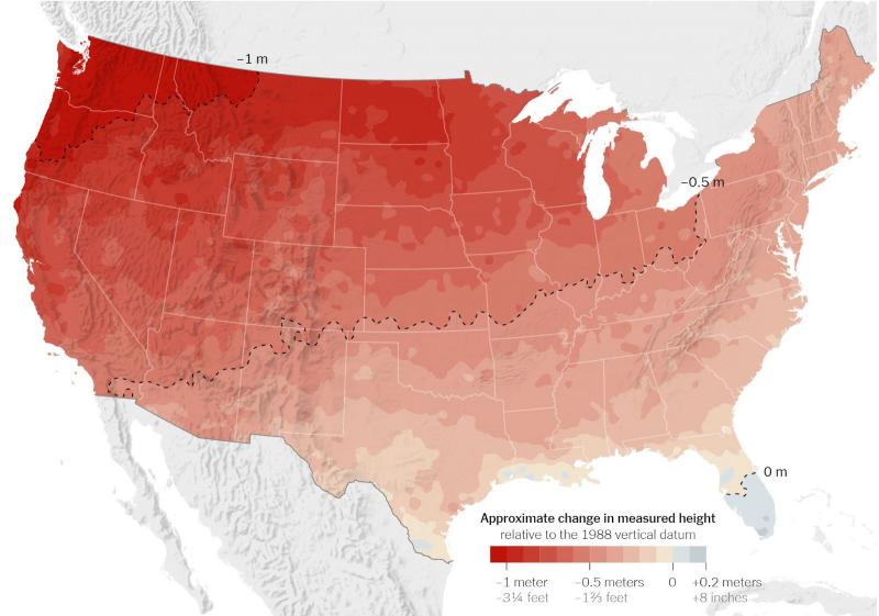 Os erros de altura são ampliados à medida que se move diagonalmente pelo país, do sudeste ao noroeste. Uma das poucas áreas dos Estados Unidos que se espera manter a mesma altura ou subir muito pouco será a parte baixa da Flórida.