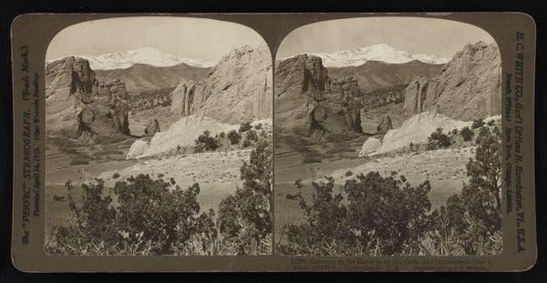 Figura 5: Pikes Peak, visto através da porta de entrada para o Jardim dos Deuses, atualmente a altitude é de 4.302,25 metros, no Colorado, em 1903. Crédito ... Biblioteca do Congresso.