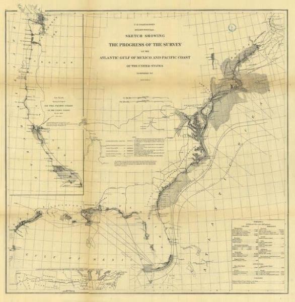 Figura 6: Um esboço da US Coast Survey de 1873. Os erros das alturas dos EUA são ampliados à medida que se move diagonalmente pelo país, do sudeste ao noroeste. Crédito ... NOAA Biblioteca de fotos.
