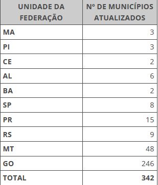 Além disso, em função da necessidade da atualização contínua da Base Territorial, especificamente em relação ao desenho da malha municipal, foram realizados ajustes cartográficos em vários municípios, em função da disponibilidade de novos insumos cartográficos, em especial no que se refere a quantidade nos estados do Maranhão e Goiás.