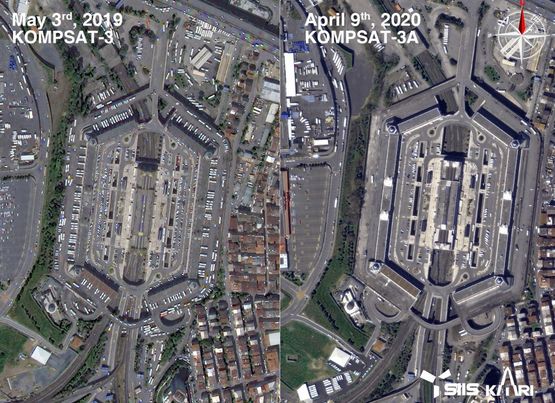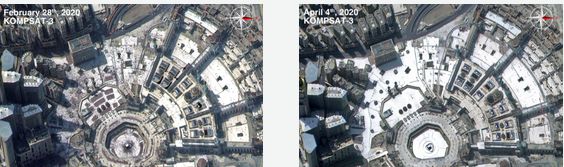 A quarentena e o isolamento social mudaram hábitos de aglomerações de pessoas em vários locais do mundo. Na imagem de satélite abaixo do KOMPSAT-3, operadora SI Imaging Services (SIIS), observa-se a Kaaba em Meca na Arábia Saudita. A cidade é considerada a mais sagrada no mundo para os muçulmanos, e foi registrada em data anterior e posterior a quarentena (28 de Fevereiro e 4 de Abril de 2020).