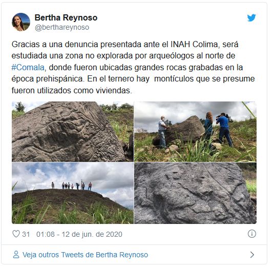 Graças a uma comunicação enviada ao INAH em Colima, uma área inexplorada será estudada por arqueólogos a norte de Comala, onde estavam localizadas grandes rochas gravadas na época pré-hispânica. No local existem montes que se presumem terem sido utilizados como habitação.