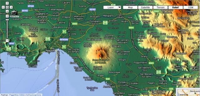 Acima, o Peru. Na imagem superior, imagem cobrindo grande parte do país. Embaixo, imagem em zoom da região da capital, Lima. Também no serviço http://www.maps-for-free.com/ podemos observar a topografia dos principais vulcões ao redor do mundo. basta escolher o vulcão em VOLCANOES e a imagem correspondente surge na tela. No caso abaixo, o vulcão Vesúvio, no sul da Itália. (Figura 5)