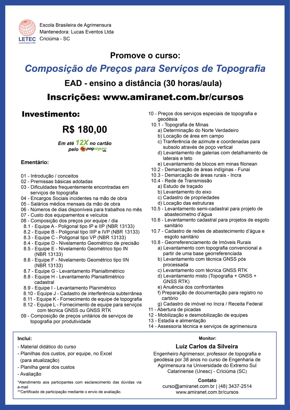 Quero fazer a minha inscriçãoCurso: Composição de Preços para Serviços de Topografia - EAD - ensino a distância (30 horas/aula)