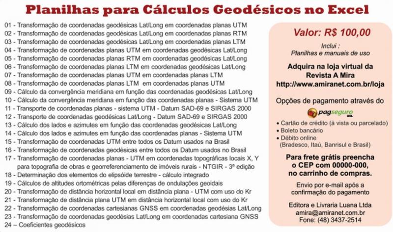 Biblioteca Virtual / Cálculos de Agrimensura / 24 Panilhas “Cálculos Geodésicos” / CURSOS / Geoplani TRANSFOGEO / Topolindes 50G / Geoplani MEMOGEO / Edição Atual / Edições em PDF / Composição Preços Serviços / Coleção A Mira 01 a 191 / Apostilas Agrimensura / Geodésia aplicada à Topografia / Gerar KML / Planilhas para Cálculos Geodésicos no Excel